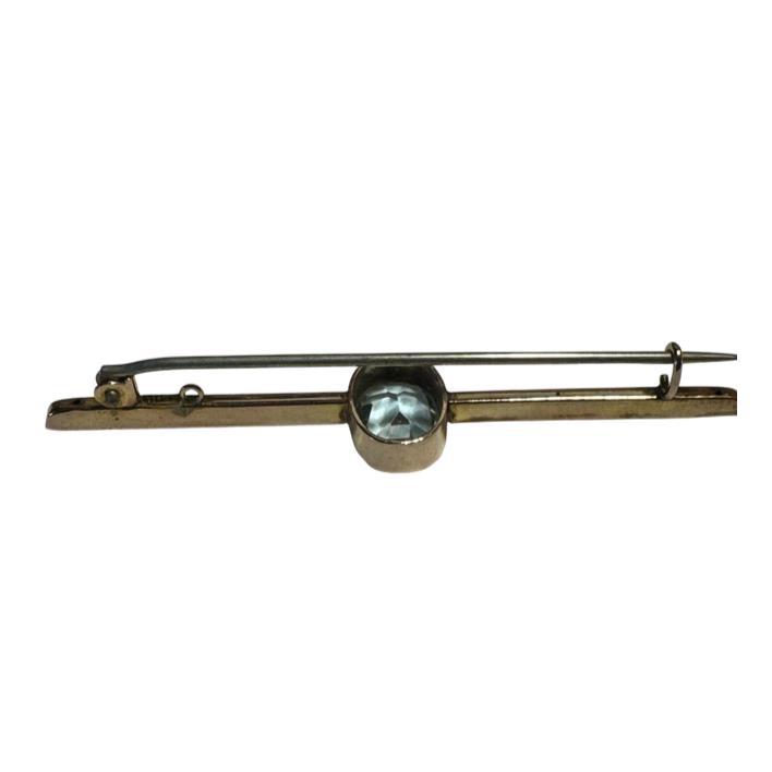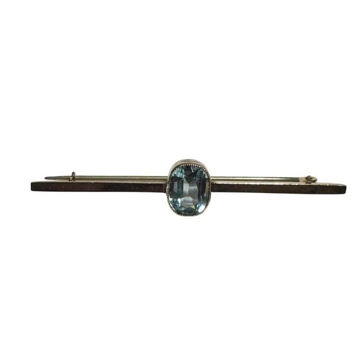 An Edwardian 9ct gold bar brooch set with a single blue topaz, circa 1910.