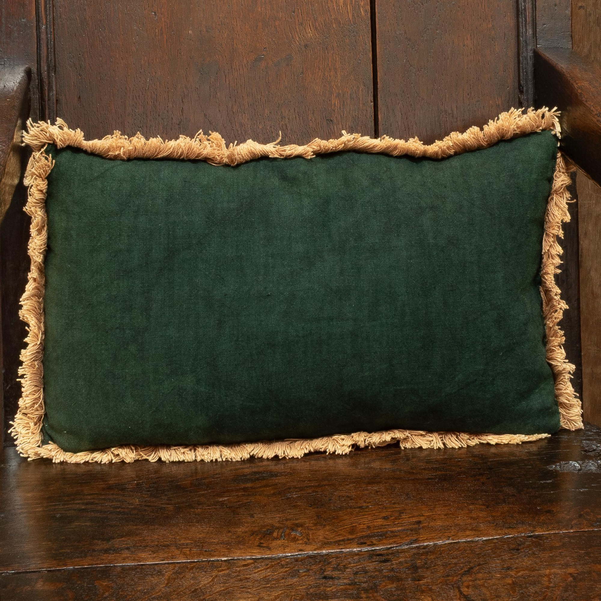 Woven in vibrant coloured wools and designed with fruit and flowers, edged with an ivory cotton fringed braid and backed with a forest green linen, feather-filled and sewn closed, constructed during the 20th century