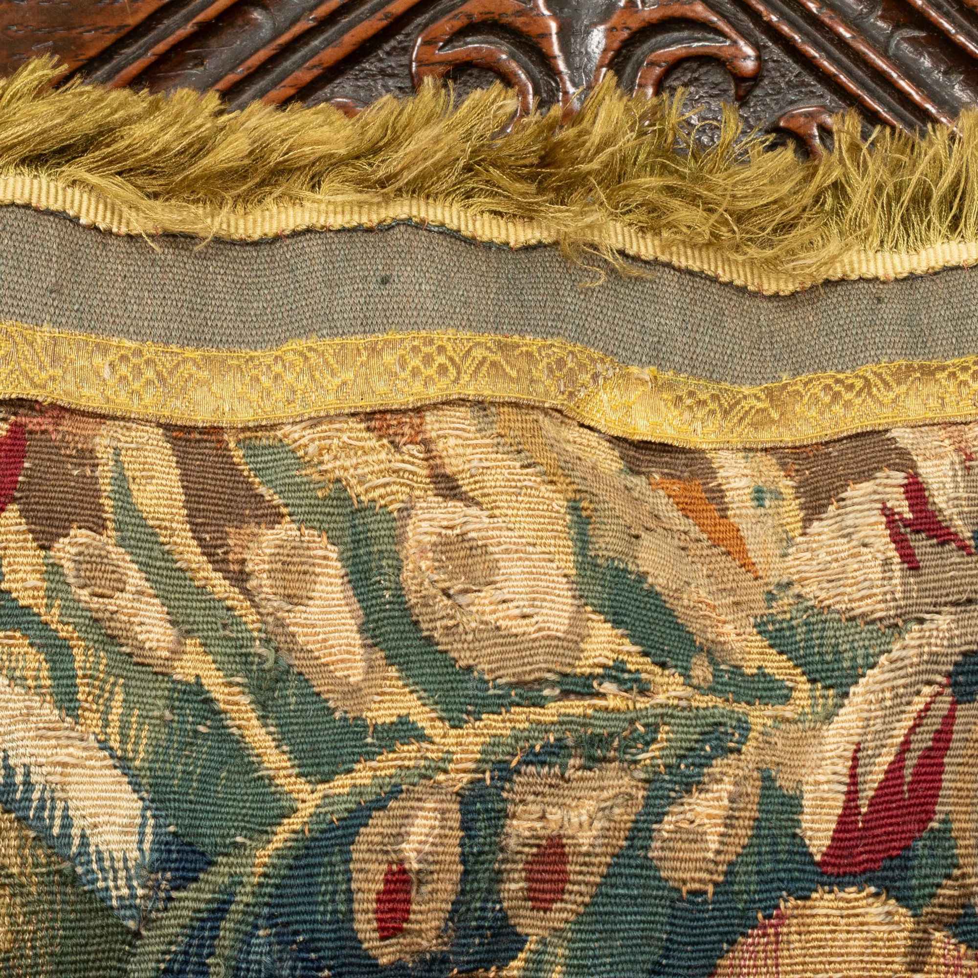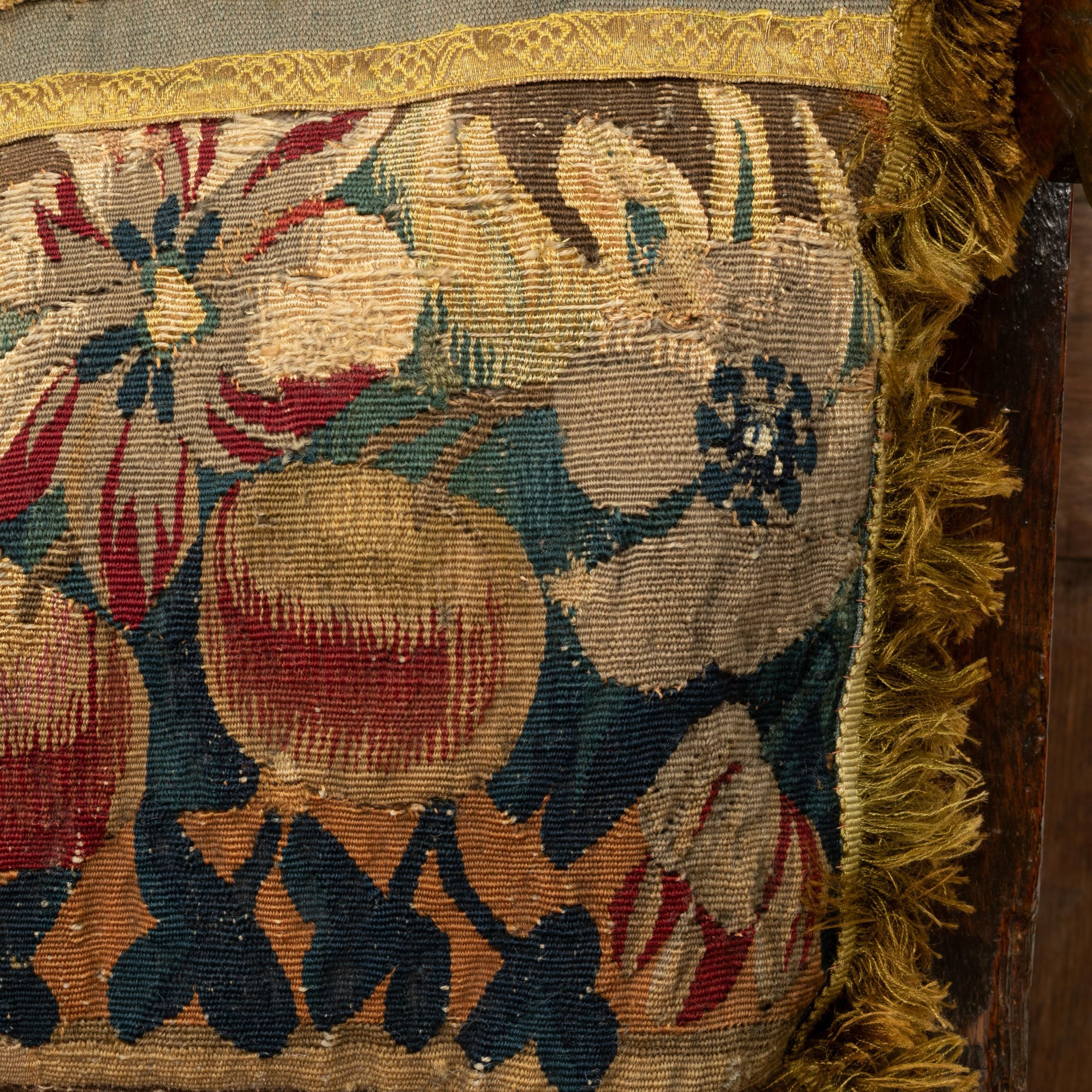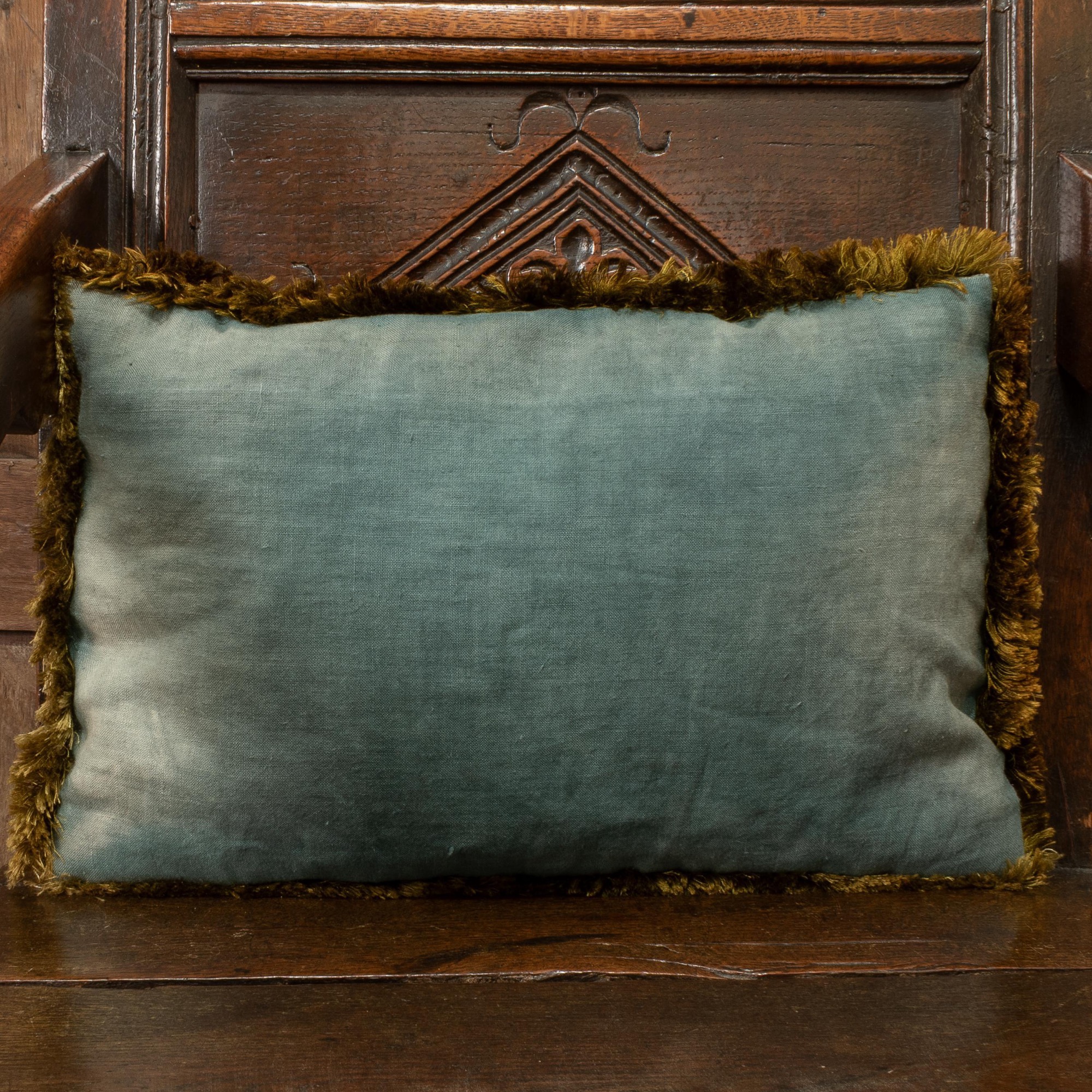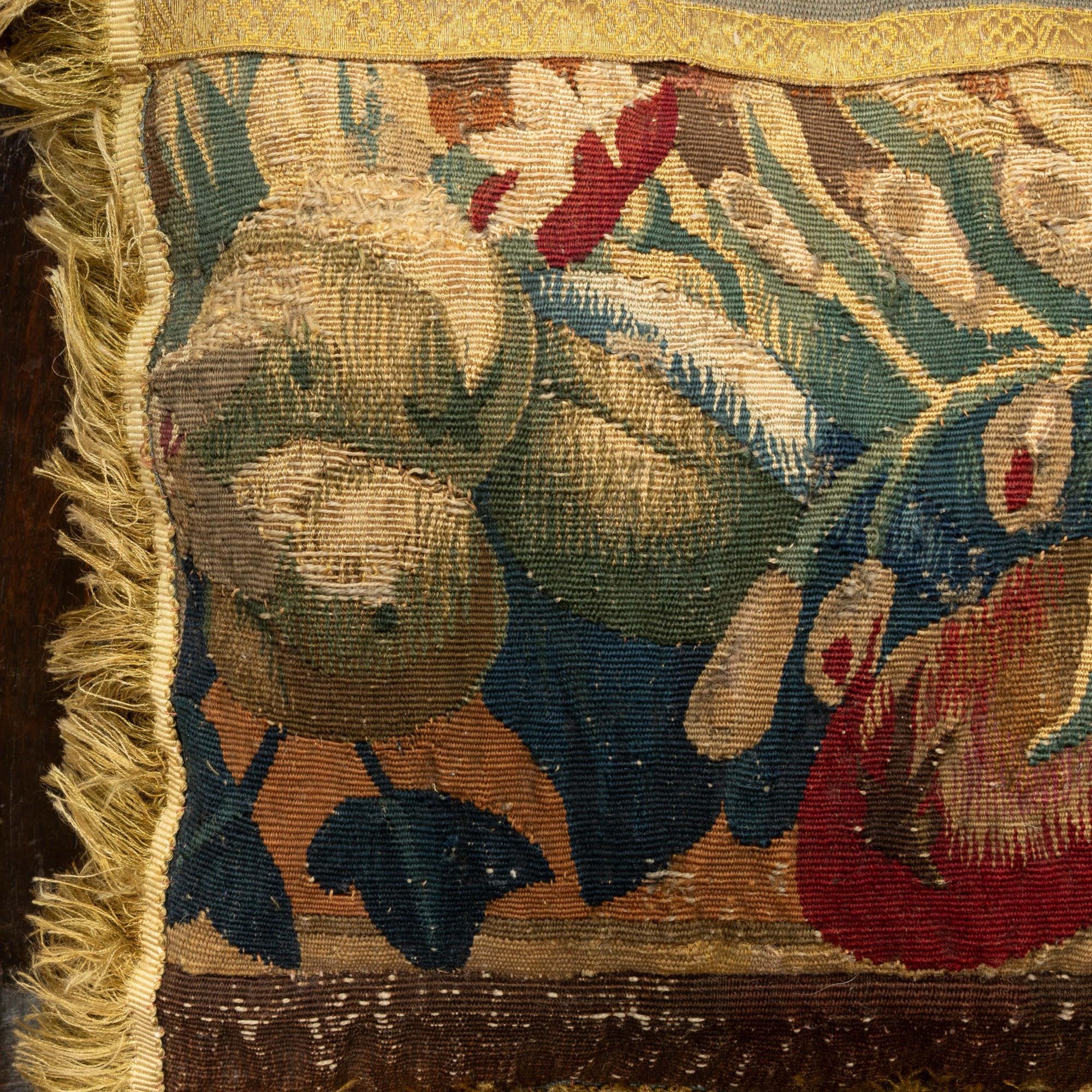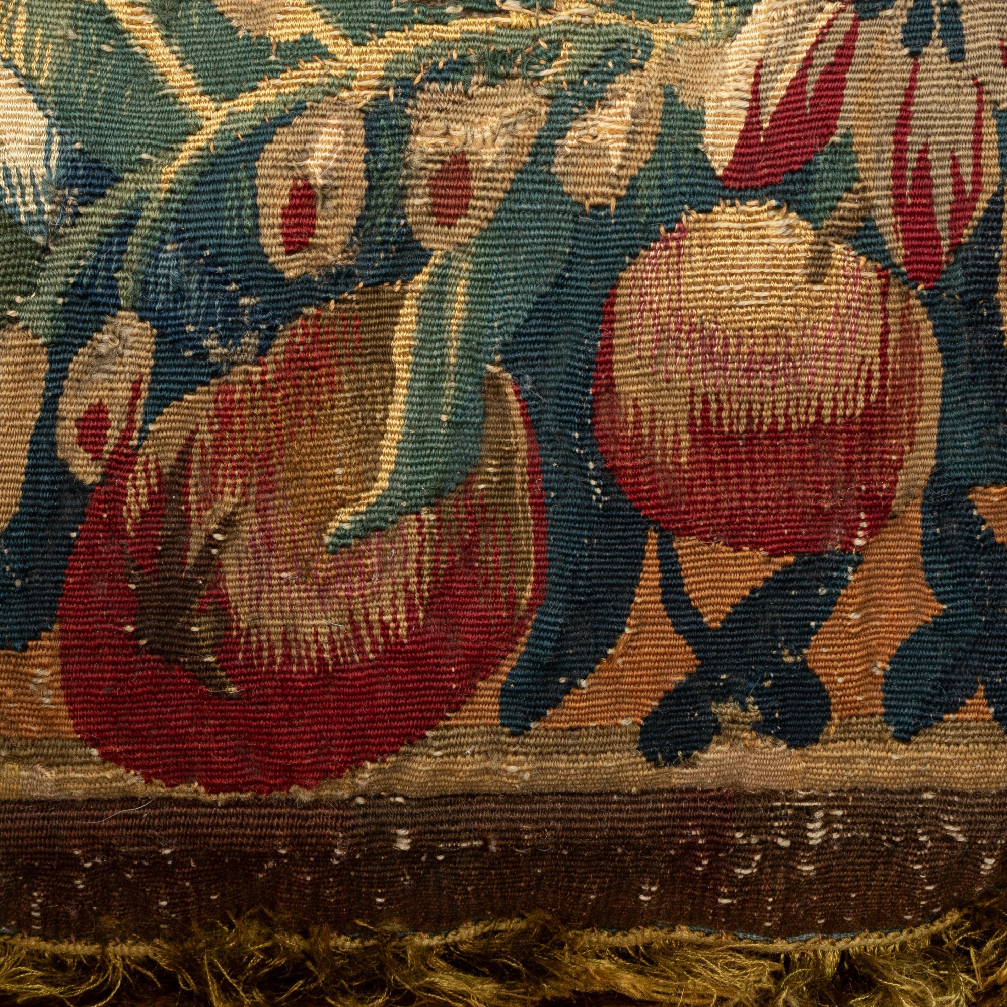 Woven in vibrant coloured wools and designed with a band of fruit and flowers, edged with a gold silk fringed braid and backed with a pale blue linen, feather-filled and sewn closed, constructed during the 20th century, dimensions are seam to seam