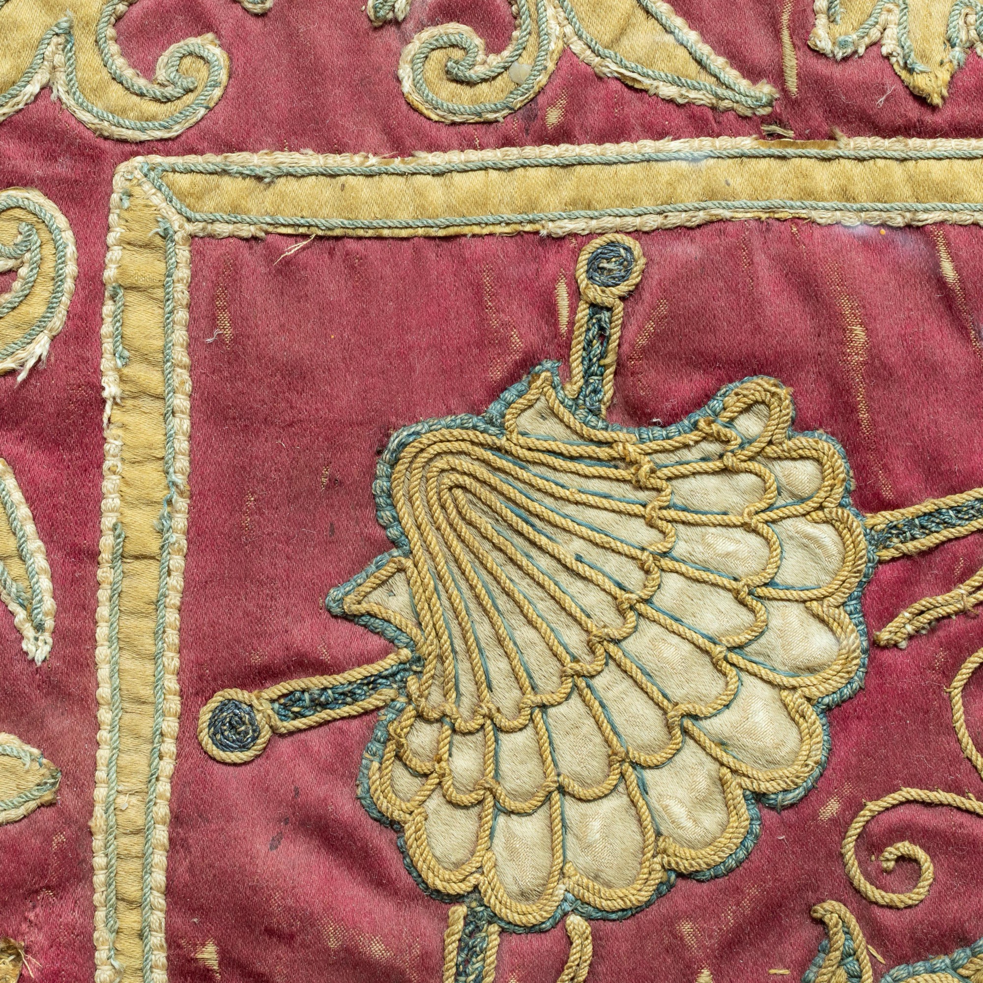 A needlework and appliqué silk cushion cover, Italian or possibly Spanish, circa 1600-40