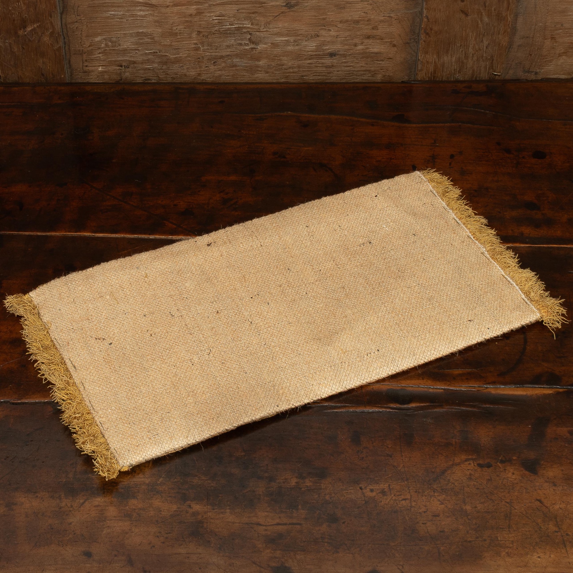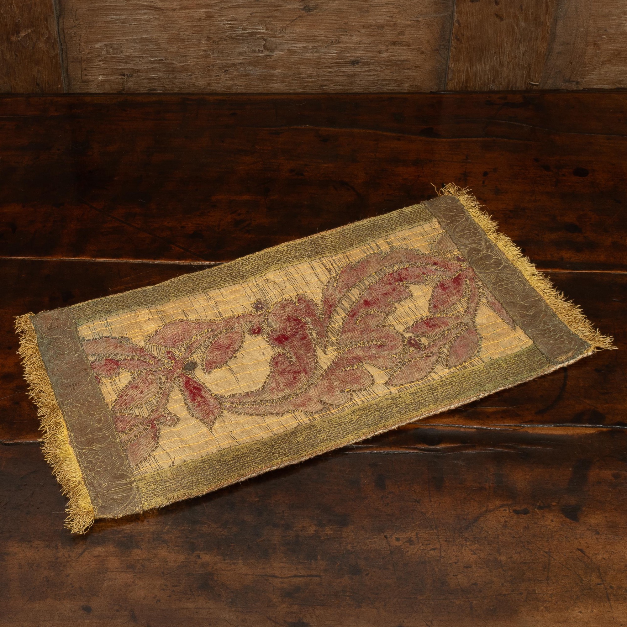 Originally part of a hanging, historically repurposed for a table runner, the plain crimson silk velvet appliqué designed with stylised scrolling leaves on a metal thread and linen ground, edged with metallic braid, each end with golden silk fringe, recently hessian backed