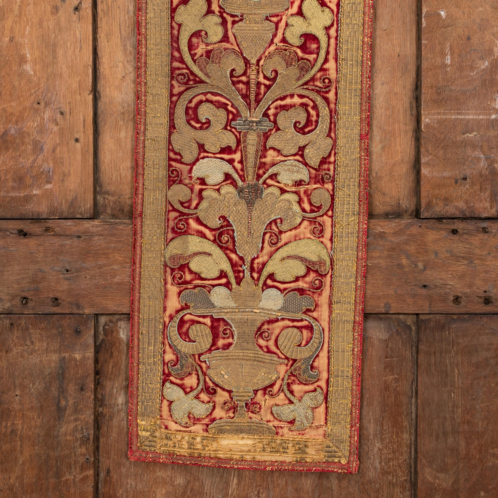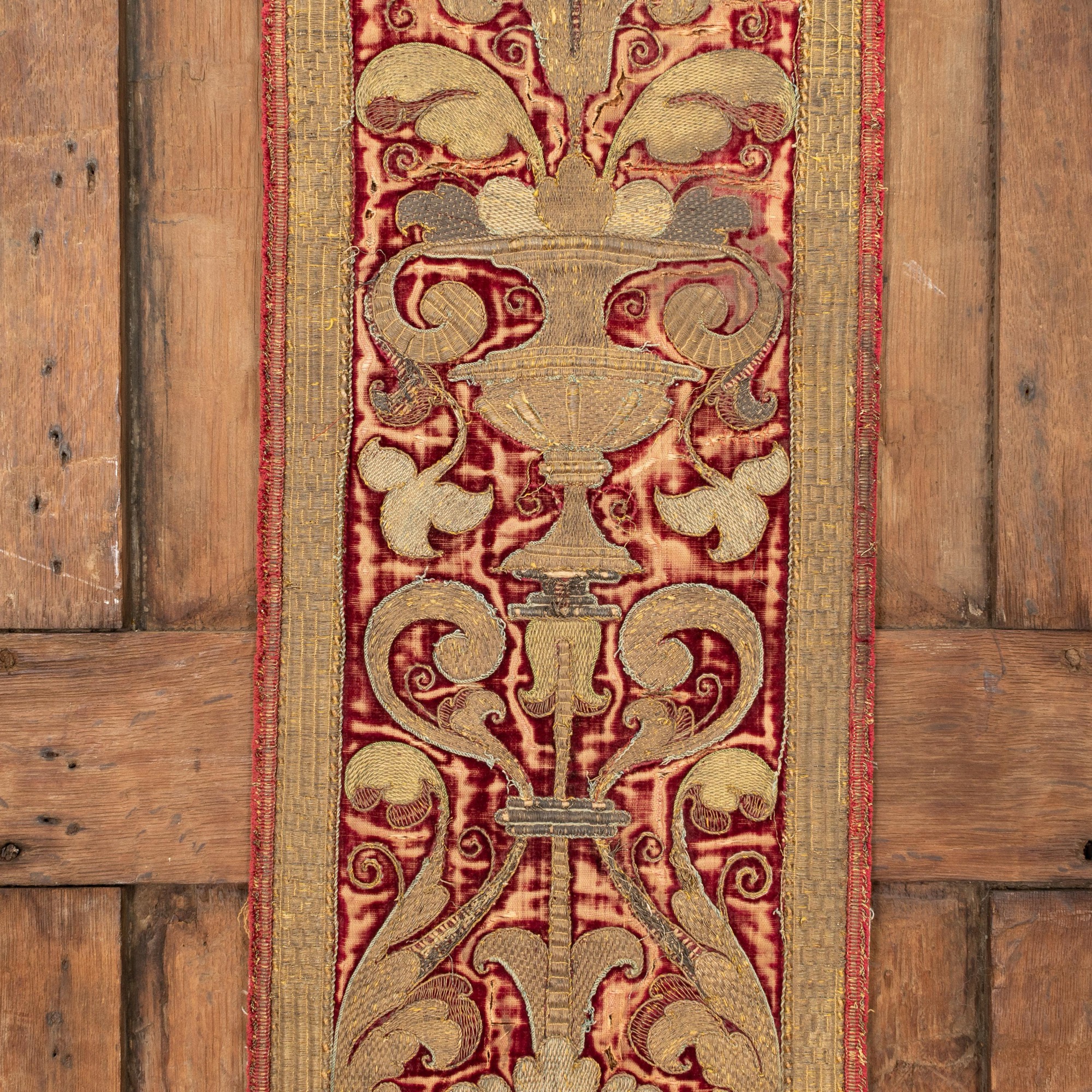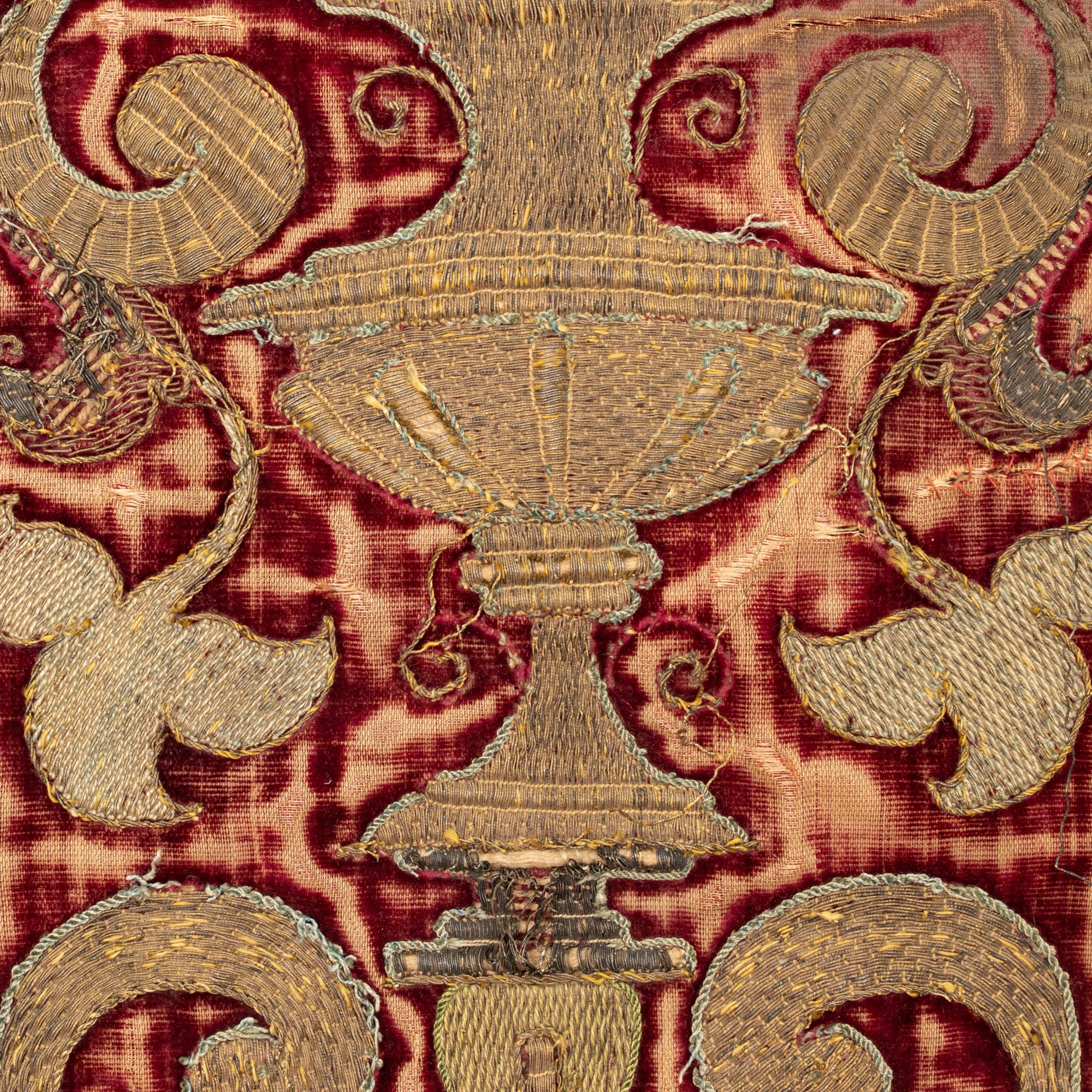 The crimson velvet ground embroidered with laid and couched metal threads designed as leafy-scrolls issuing from urns, bordered with woven metal thread braid, backed with a fine hemp weave, labelled 'J. Seberg, Antwerpen'
