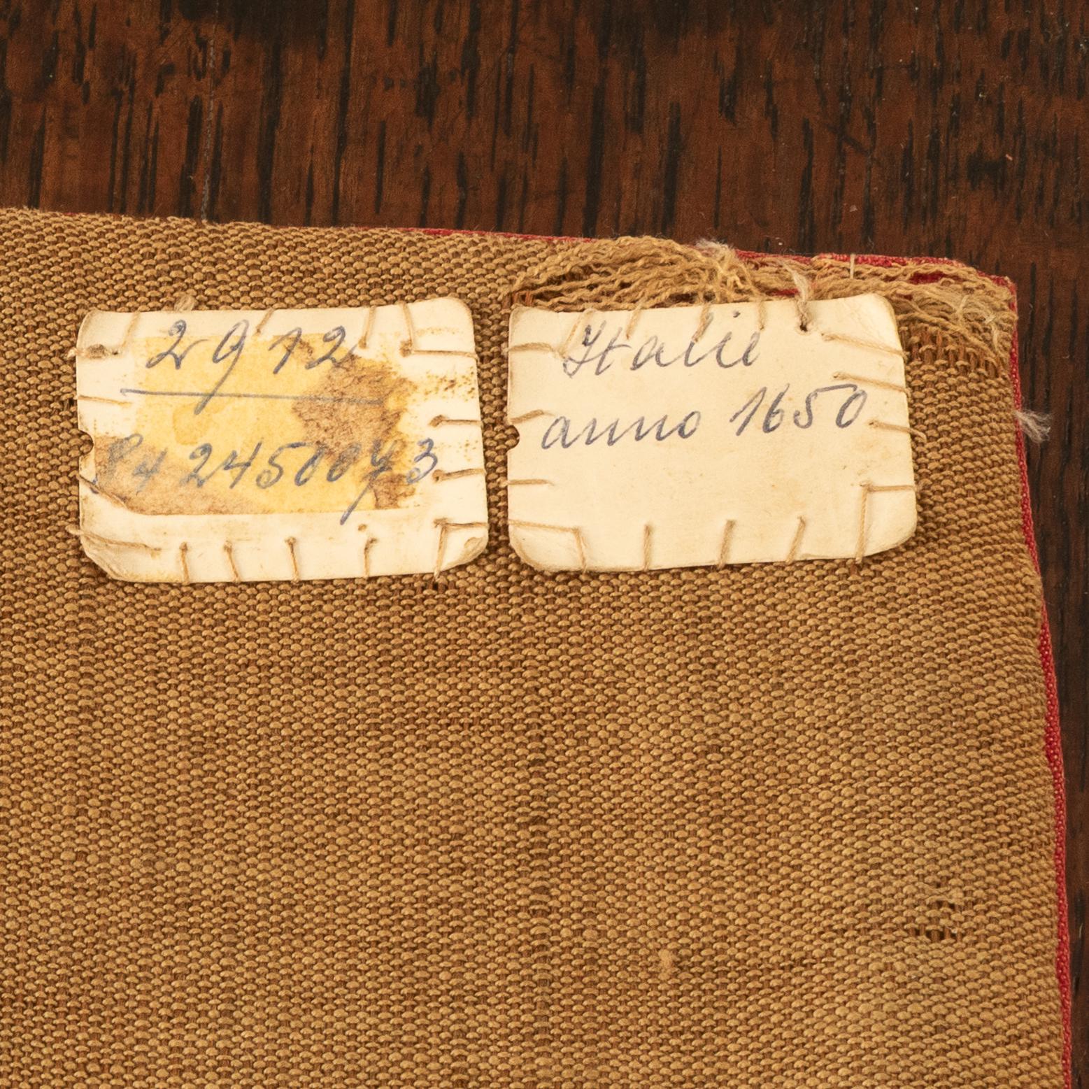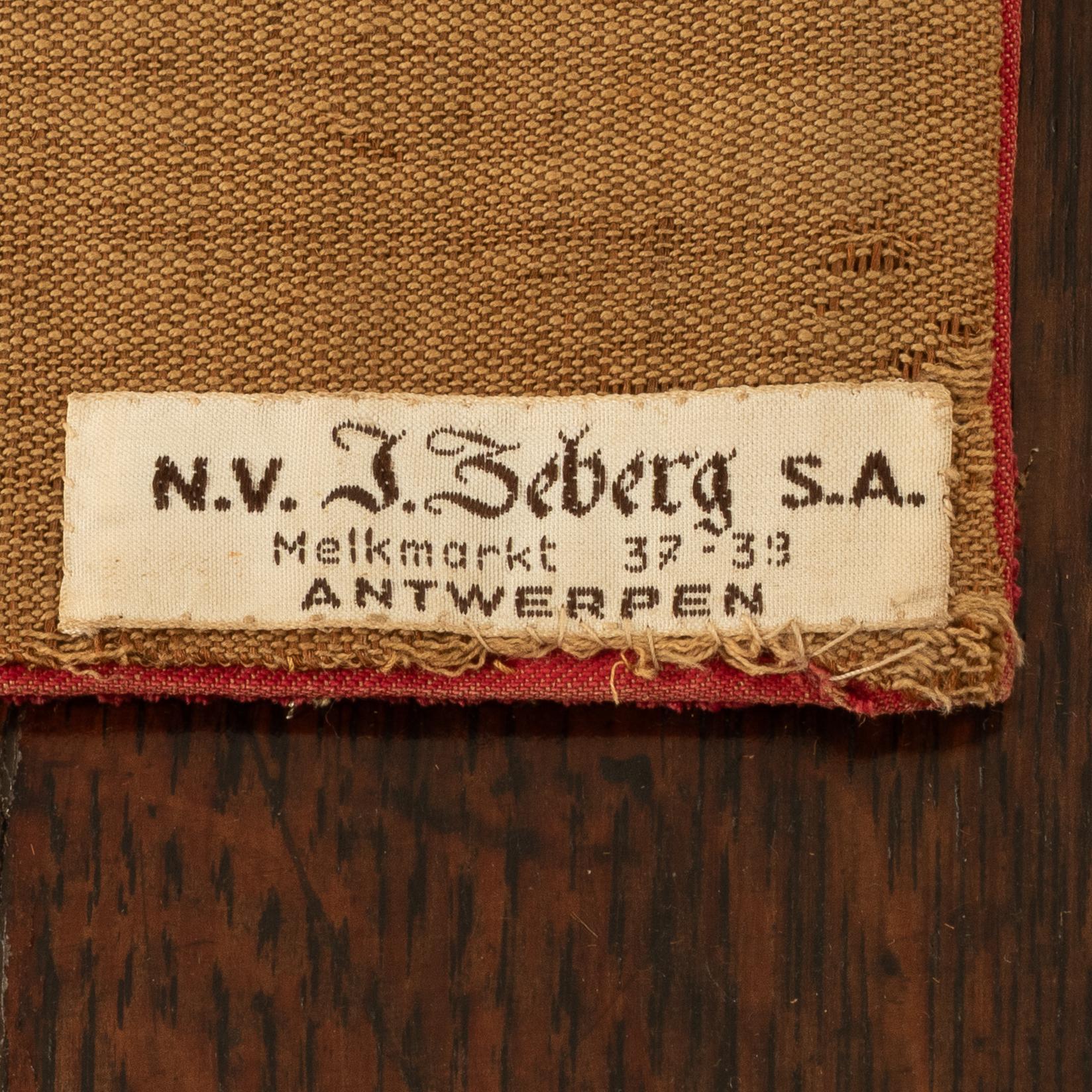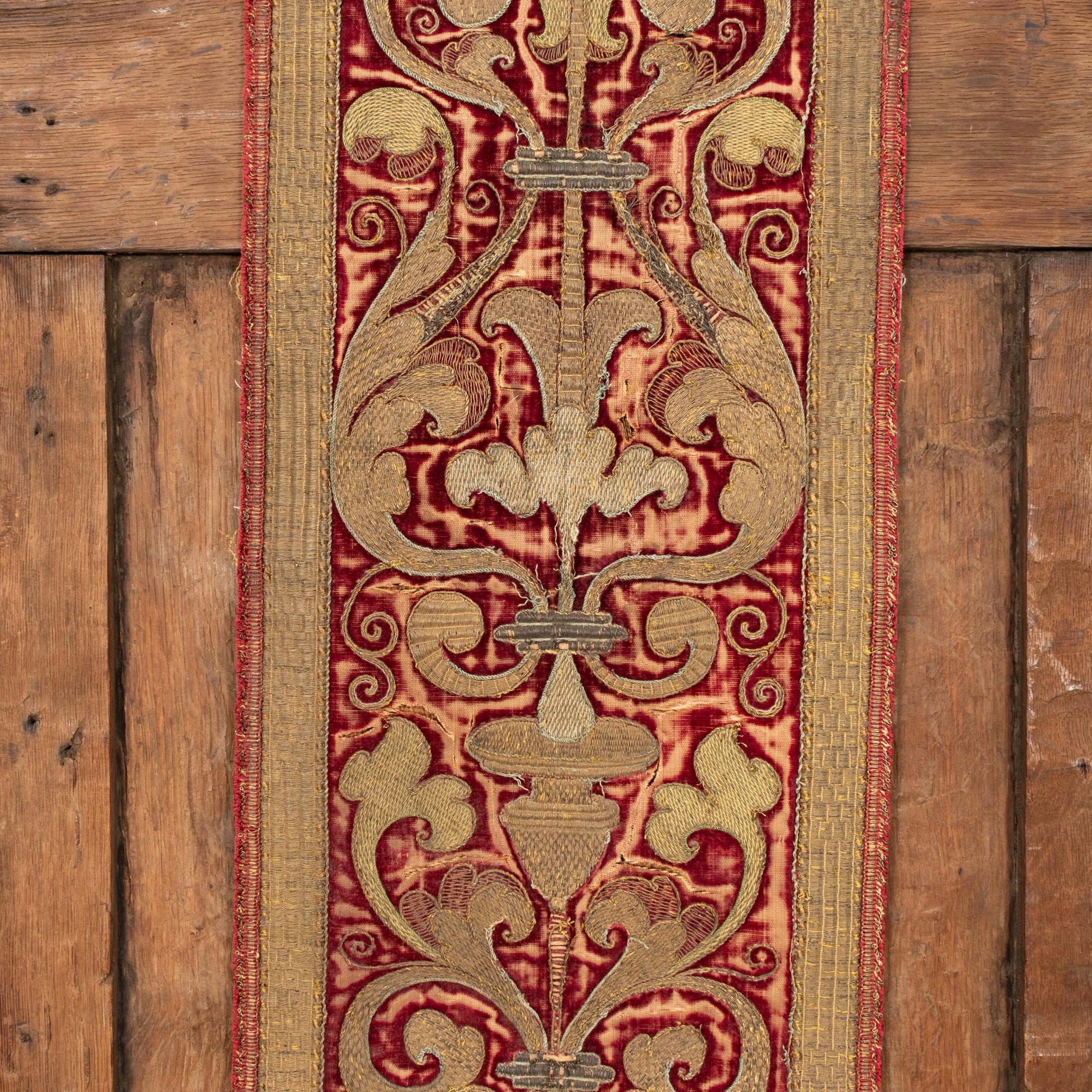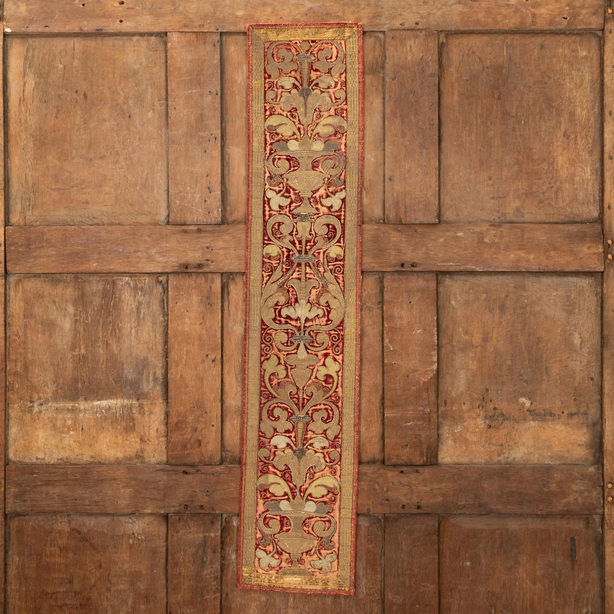 The crimson velvet ground embroidered with laid and couched metal threads designed as leafy-scrolls issuing from urns, bordered with woven metal thread braid, backed with a fine hemp weave, labelled 'J. Seberg, Antwerpen'