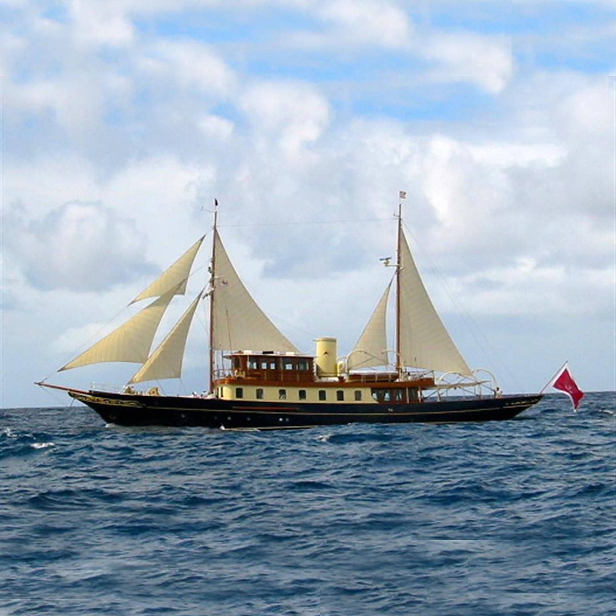 There is an interesting back story to this motorsailer. Originally built for Sir William Burton KBE, a distinguished yachtsman and J Class challenger for the America's Cup in 1930, and designed by the gifted English naval architect Alfred Mylne, the motor yacht Caleta, as she was originally named, was built in 1930 in Dartmouth with the specific purpose of providing accommodation for the owner and his guests at each regatta.