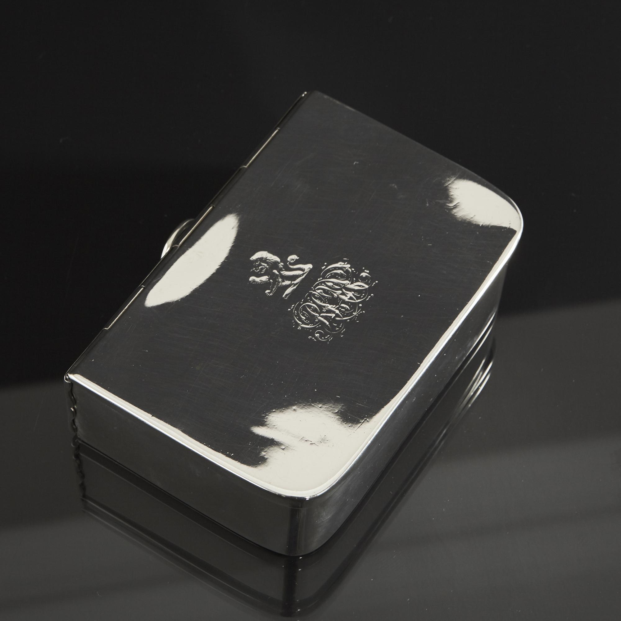 Charming antique silver sandwich or lunch box made in the Victorian era to be taken out on game shoots, fishing trips or other country pursuits. It slips comfortably into a hunting or outdoor jacket pocket. The box is of a substantial silver gauge and is fitted with a D-shaped swing handle.