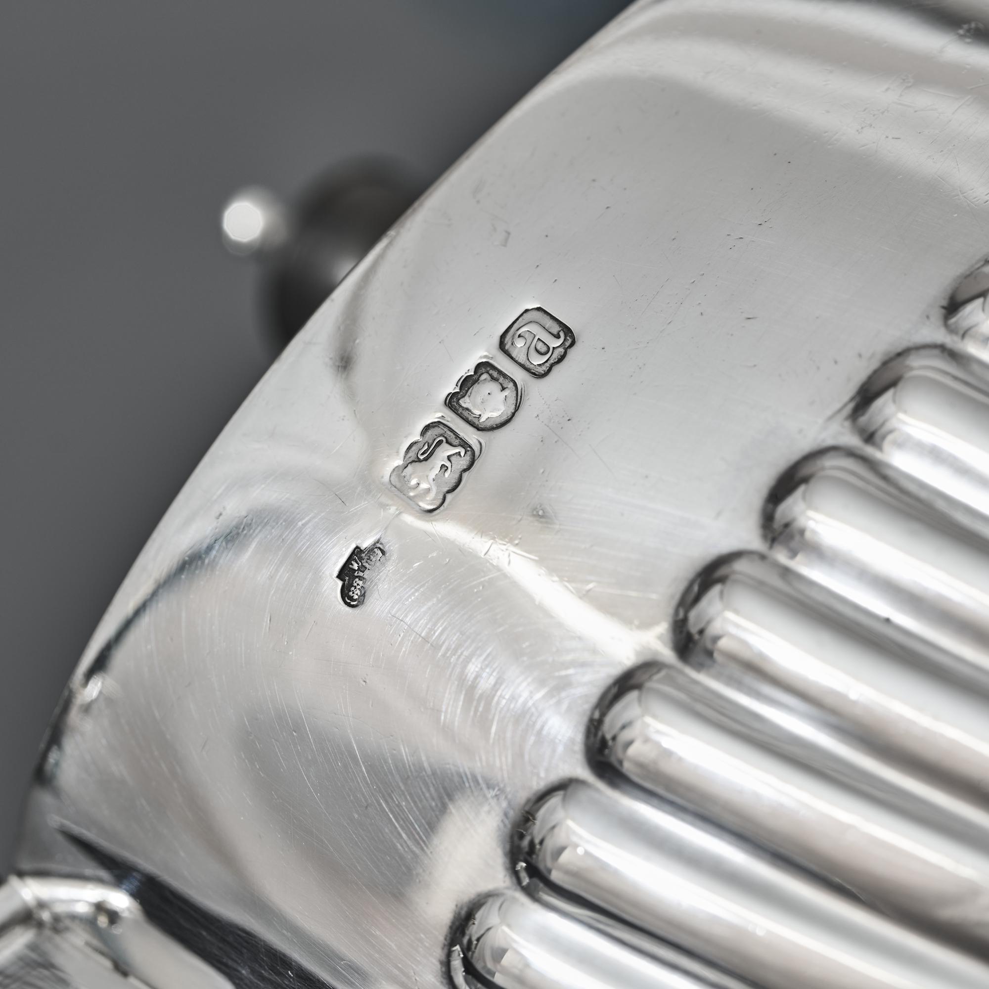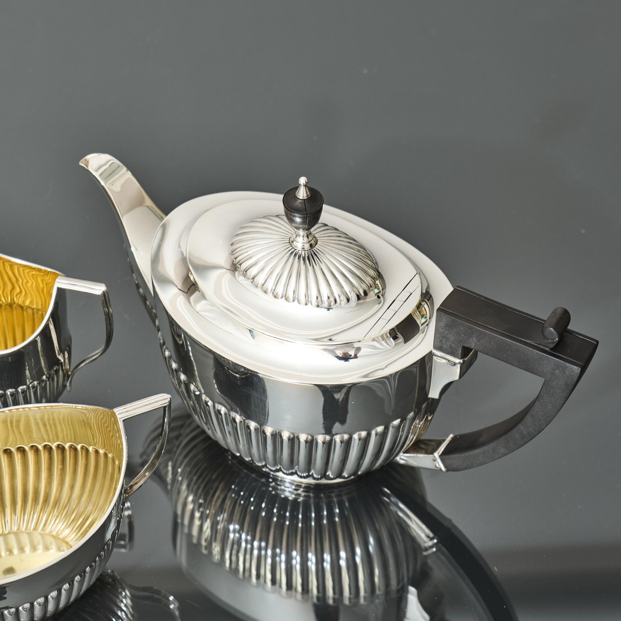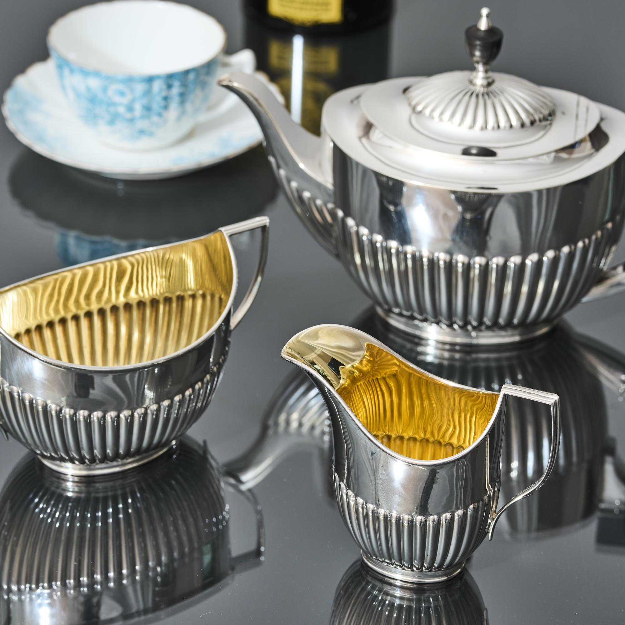 Classic, Victorian Queen-Anne-style three-piece silver tea set with all pieces featuring the characteristic half-fluted bodies. Although the pattern is referred to as Queen Anne style, it is in fact more reminiscent of the neoclassical revival era of the 1790s.