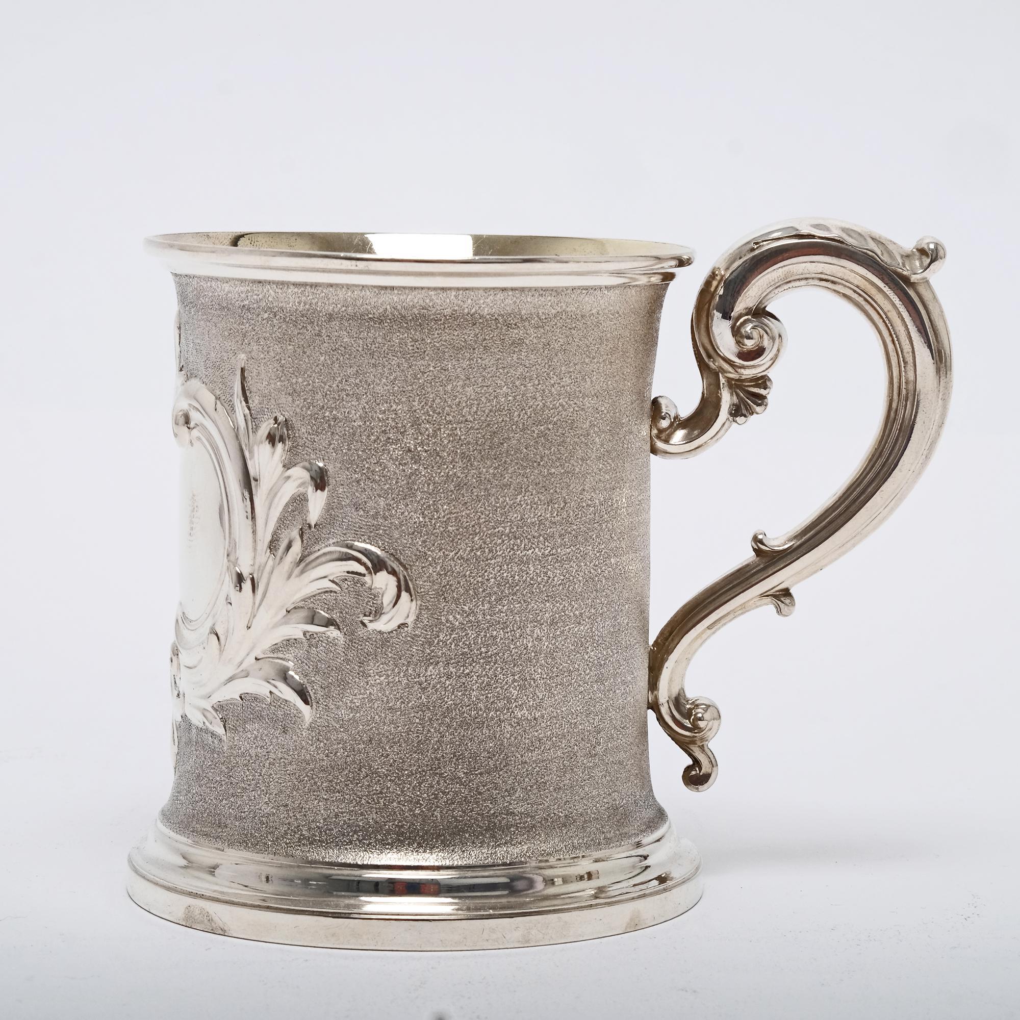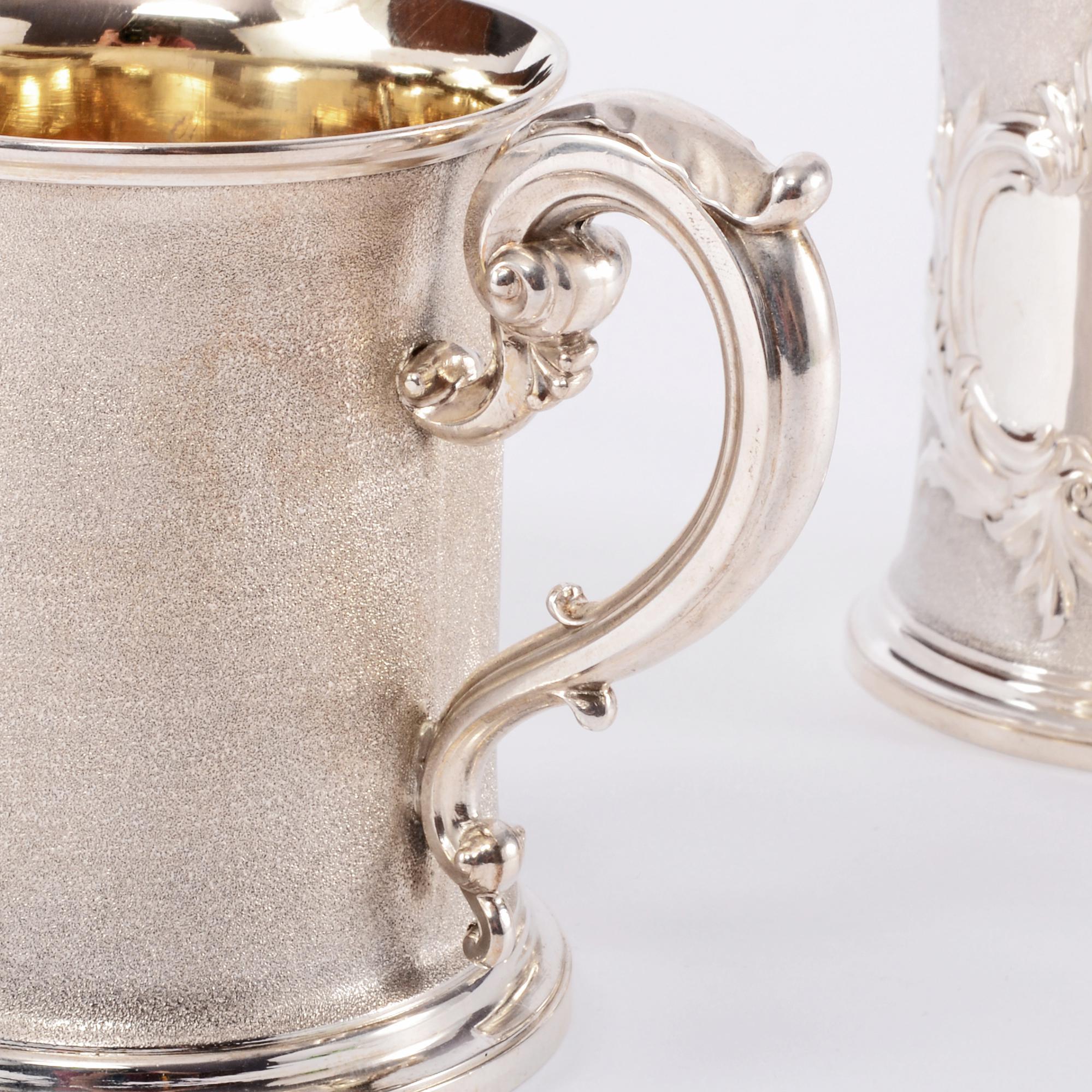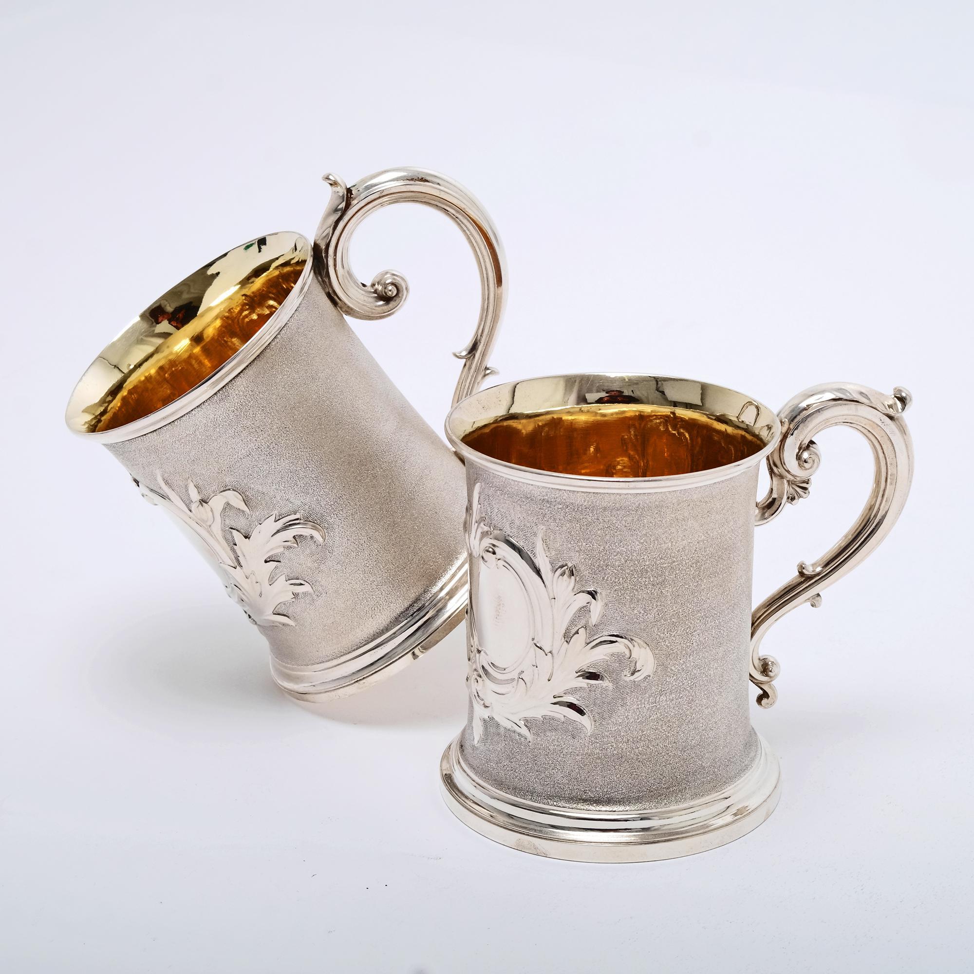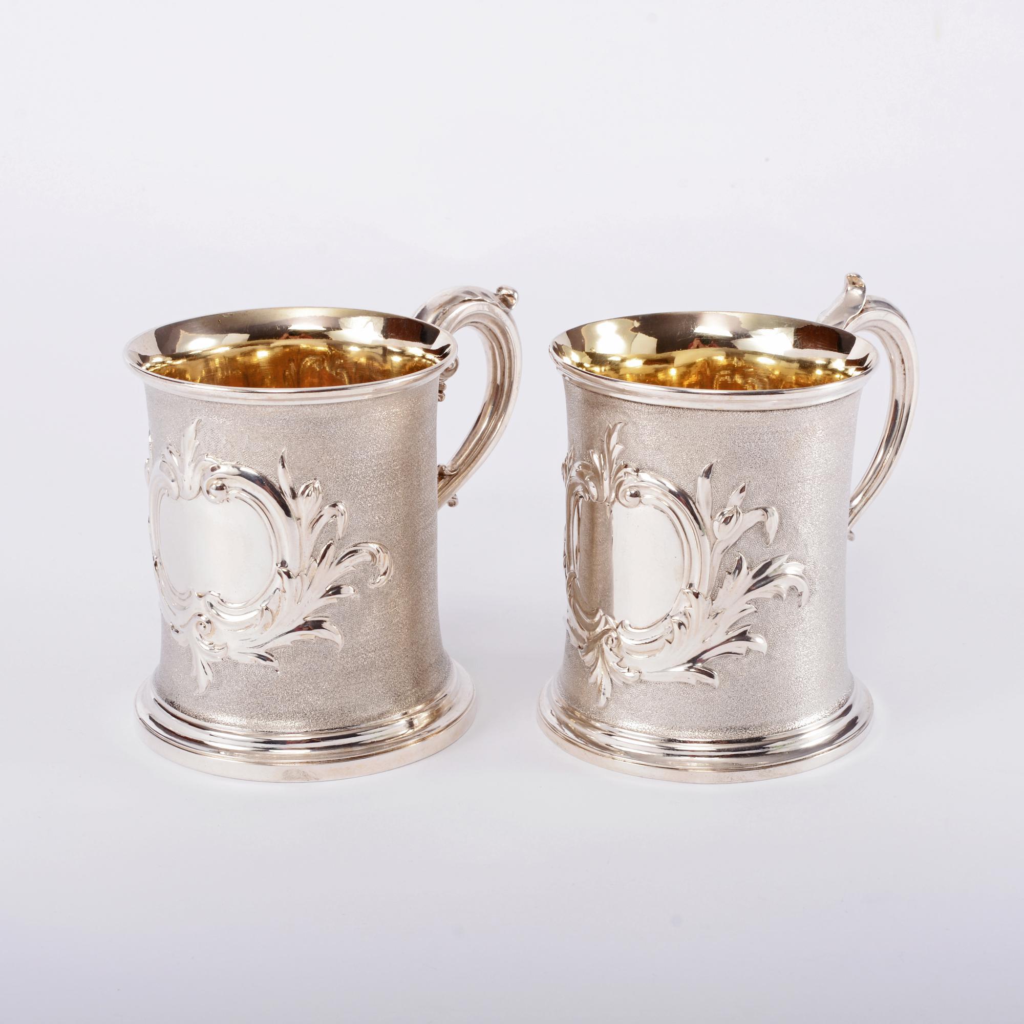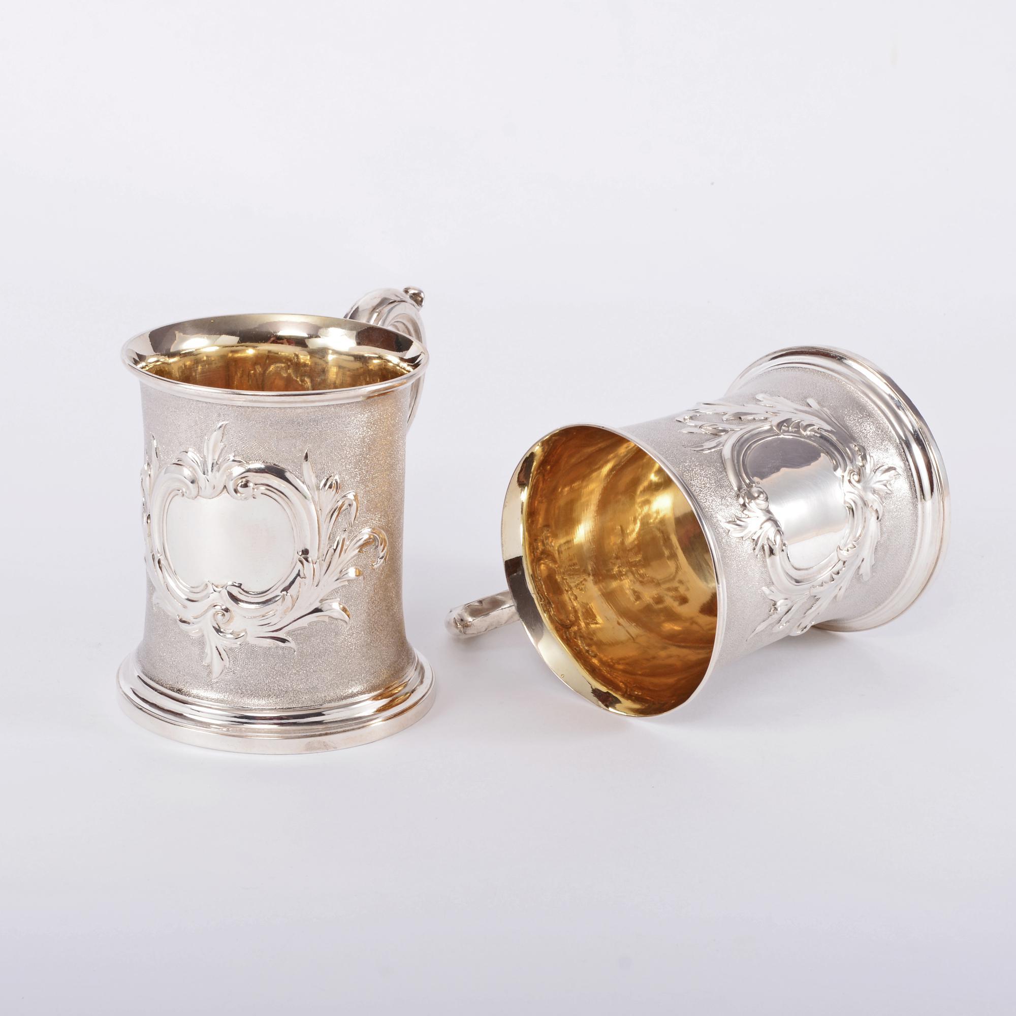 Pair of early Victorian silver half-pint mugs with hand-chased mottled and textured bodies. Each has a floral cartouche and gilded interior and they are unusual both in their design and the fact they are a pair.