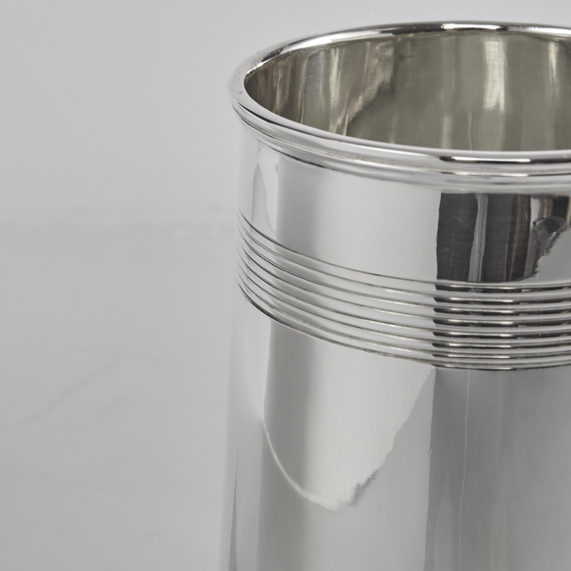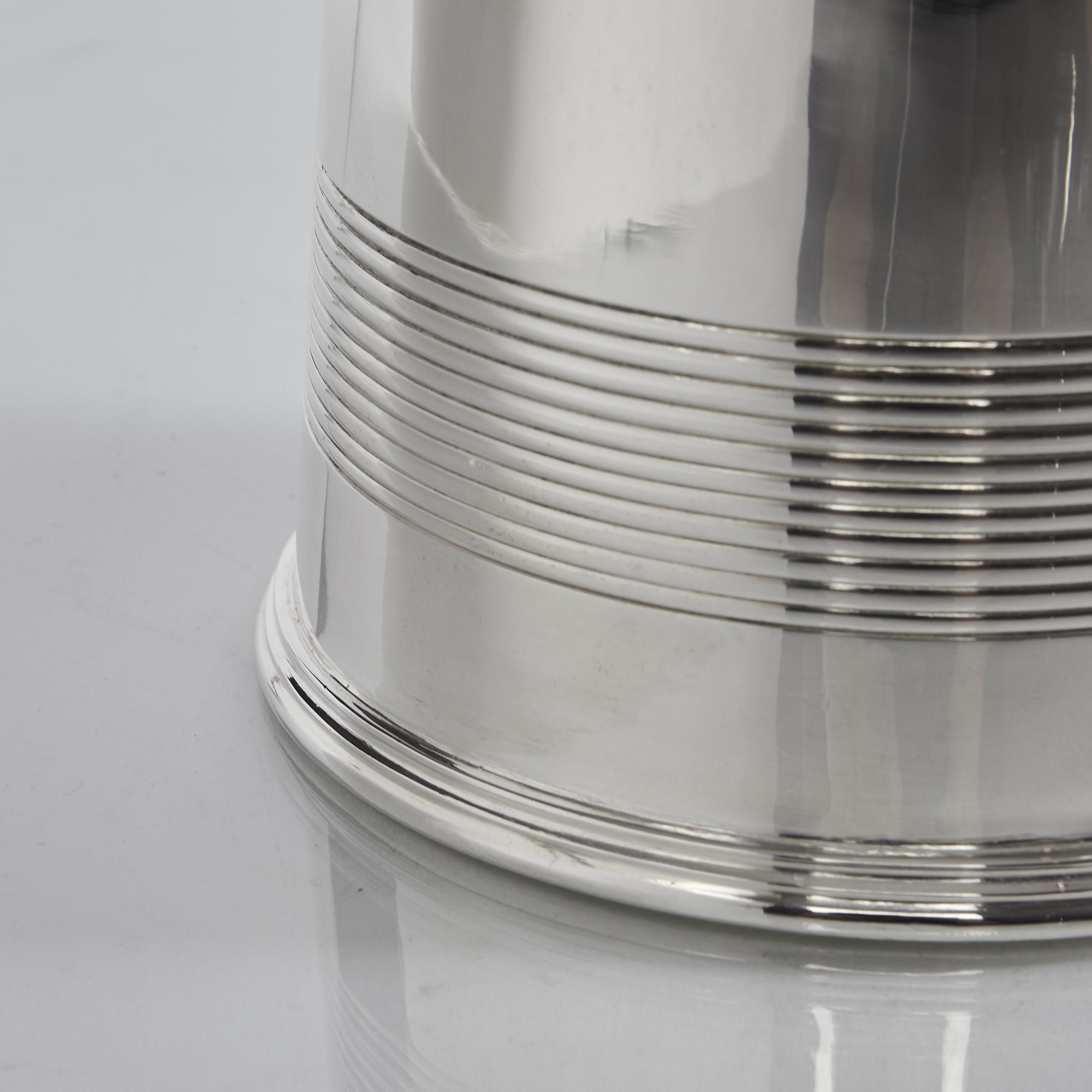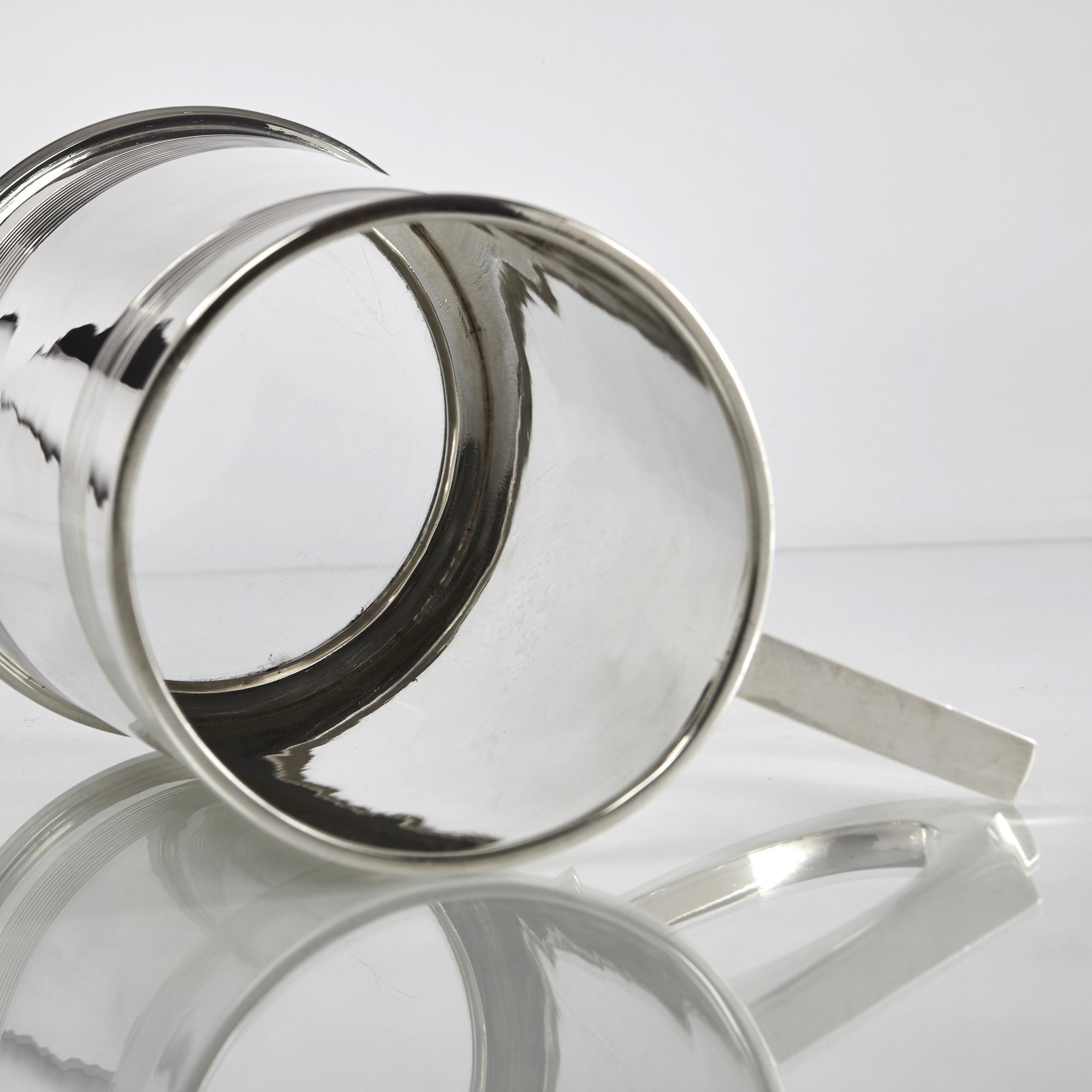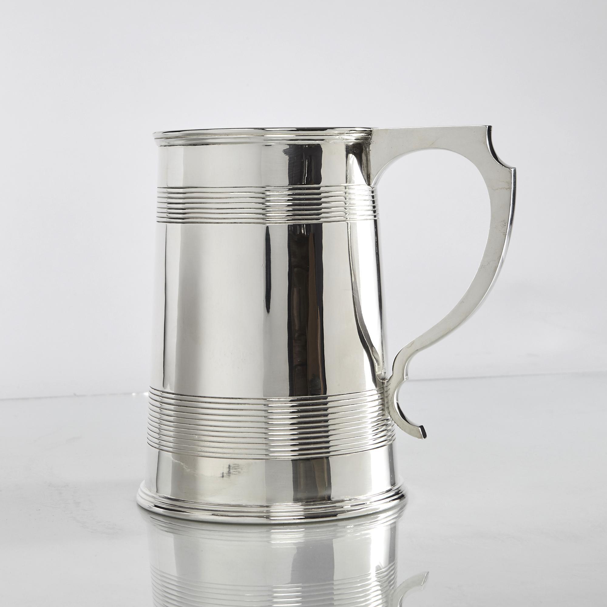 A silver mug is a lidless drinking vessel with a handle and English silver mugs were made in graduated sizes; the most common being the quart, pint, half pint and gill. Gallon and half gallon mugs like this example appear from time to time.